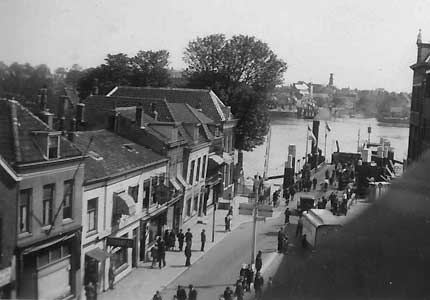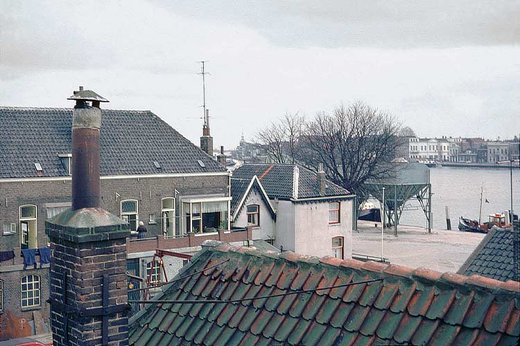 Kijken we daarom eens nauwkeuriger naar de dakvorm. De voorgevel had een dak met een noklijn die evenwijdig liep aan de straat. Het achterste gedeelte van het pand had een noklijn die daar weer haaks op stond. Heeft de daklijn, van het achterste gedeelte, doorgelopen naar de oudere "voorgevel met schoorsteen"? Waarschijnlijk wel. Er waren diverse zaken die daar op duidden. Allereerst de merkwaardige constructieve verbinding tussen de twee dakvormen. Hierbij was duidelijk een "gekunstelde" verbinding gemaakt. Het dakbeschot van het oude dak was daarbij duidelijk provisorisch afgezaagd. Het belangrijkste bewijs was echter de langwerpige hoofdconstructie (buitengevels) van het pand. Een dergelijke vorm duidt op een noklijn die evenwijdig loopt met de lengte (diepte) van het pand. Het is dus zeer waarschijnlijk dat de voorzijde van het pand oorspronkelijk aan de andere kant lag. Op de voorgrond van de foto is het dak van het Veerhuis te zien, aan wat nu de achterzijde is (1963). Foto © Lucien den Arend.
