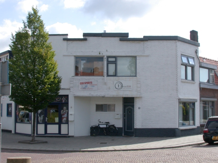 Nummers 1-6 en 11-12 woningen, nummers 7-8 en 9-10 woningen met winkel op de afgeschuinde hoek.