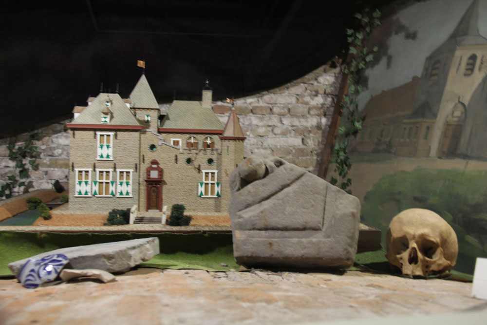 Maquette Kasteel Develstein  De beruchte Galgsteen Vitrine met oude gebruiksvoorwerpen