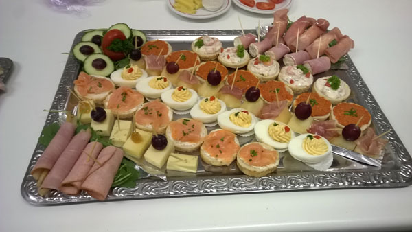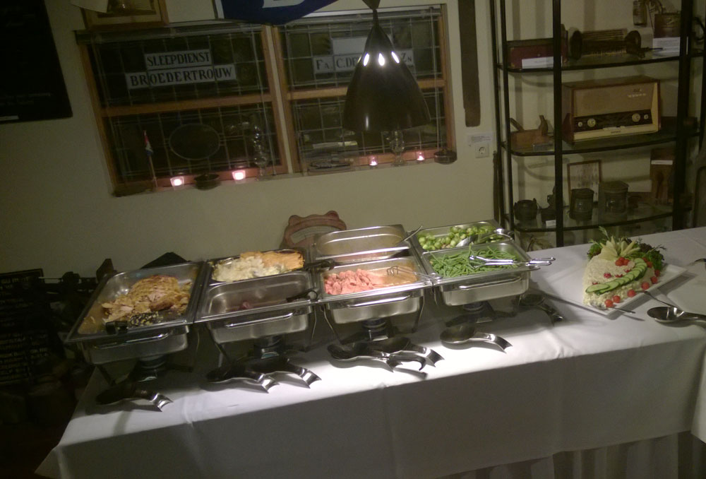 Met de verhuur van de gelagkamer wordt de oorspronkelijk functie van De Vergulde Swaen als herberg, in ere gehouden. De kwaliteit van de catering 'gaat voor goud', geheel in lijn met de naamgeving van ons pand. De drankjes, hapjes (foto links) en eventueel een broodmaaltijd worden professioneel verzorgd door vrijwilligers van de Historische Vereniging. Ook kunnen huurders desgewenst een cateraar een buffet/maaltijd (foto rechts) laten bezorgen. Zodoende kan er gekozen worden voor een vergadering/feestje met culinaire verzorging op maat, op een unieke locatie.