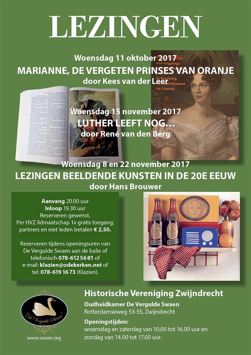 Verspreid over het jaar worden er verschillende lezingen georganiseerd in De Vergulde Swaen. Hierbij komen, naast typische 'Zwijndrechtse onderwerpen', ook andere cultuur-historische zaken aan de orde. Leden krijgen bij deze lezingen ledenkorting. Houd de website en de sociale media in de gaten voor actuele lezingen en workshops.