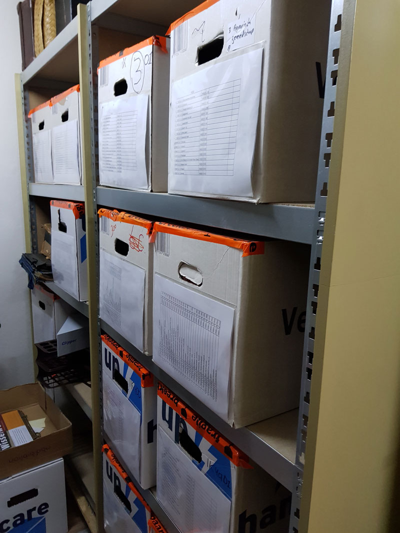 De in dozen opgeslagen voorwerpen zijn gecodeerd in categorieën volgens het collectiebeheer en op iedere doos zit een lijst met de inhoudsopgave.